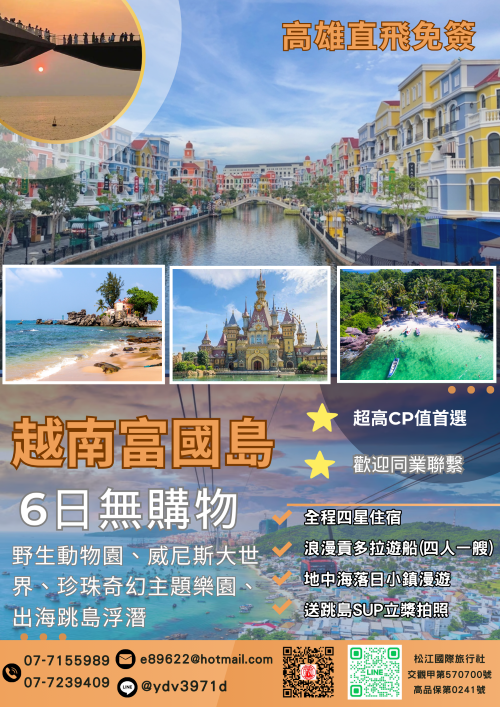 越南富國島無購物6日 威尼斯大世界、野生動物園、水上樂園、出海跳島浮潛