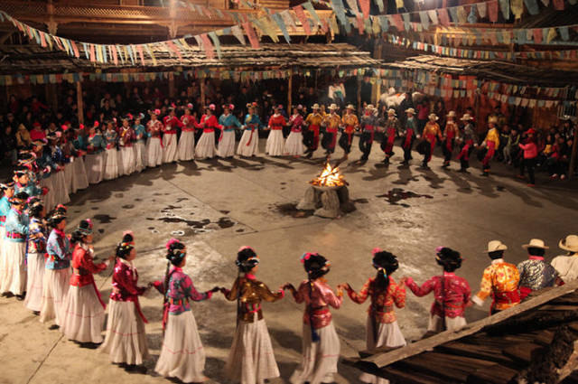 ◆【摩梭族鍋莊篝火晚會】 這是欣賞摩梭族的瀘沽湖傳統娛樂項目,是摩梭女人挑選自己情郎的佳期;晚會時男女手牽手圍成 一圈,中間燃起篝火載歌載舞,姑娘們穿戴整齊,所有飾品都戴在身,頭纏黑布大包頭,身穿白色百褶裙,高聲歌唱對情歌,再端上一碗“蘇理瑪”酒,要情郎當眾誓言忠誠。