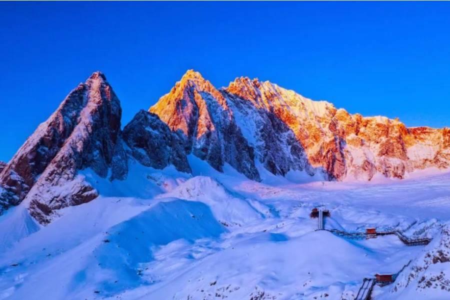 ◆【玉龍雪山】是北半球最近赤道的山脈,處於青藏高原東南邊緣,海拔5596米,由於終年積雪,當遠眺雪峰時有如潔白的晶玉,山腰雲騰霧繞,遠望像一條銀白色的巨龍,因此得名。為納西族的神山和聚居地之一;納西族人稱雪山爲「波石歐魯」,意爲白沙的銀色山岩。