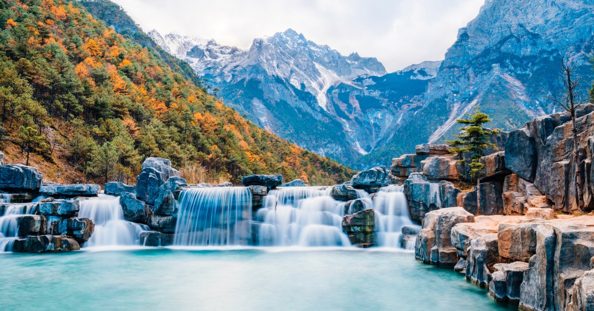 ◆【藍月穀】位於玉龍雪山腳下,因在晴天時,水的顏色呈藍色,而且山谷呈月牙形,因此得名。藍月谷中的水源自玉龍雪山的冰雪融水,流淌聚集在谷中形成河流,因為河床由白色石灰岩構成,使整條河流呈現白色,這即是白水河的來源。