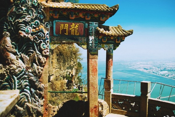 ◆【西山龍門】龍門位於西山頂部,處在羅漢峰的懸崖峭壁上,北起三清閣,南至達天閣,是雲南最大、最精美的道教石窟。從龍門可沿棧道到達西山山頂。「龍門勝景」雄居昆明西山眾多的名勝之首,有「不耍西山等於不到昆明,不到龍門只是白跑一趟西山」之說。沿龍門棧道可飽覽了龍門精湛的石刻藝術,穿過龍門隧道,沿石階而上,即達龍門新平臺。 龍門入口處有一圓柱石坊,上書「龍門」二字,並刻有「元寶」,據說能保佑人發財發達,吉祥如意,過往的遊人都喜歡用手摸一下。入門有一石欄轉護的半圓形小月臺,站在月臺眺望,人見上迎天風,下臨絕壁,五百里滇池煙波浩渺,遠處青山如黛,綠樹白房,沃野平疇,如詩如畫。石室, 正門頂端刻有「達天閣」三字,兩邊側門頂刻有「名山」、「石室」、「天臨海鏡」字樣,中柱題有聯雲:舉步維艱,要把腳跟站穩;置身霄漢,更宜心境放平。